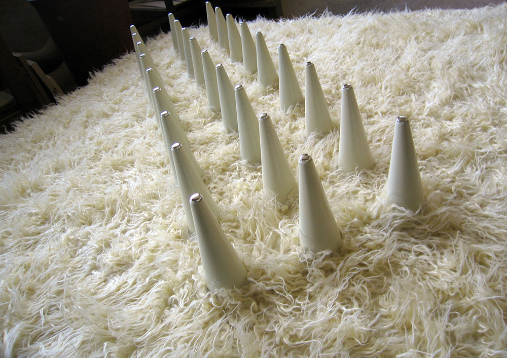 An unconventional coffe table. Hidden legs and a miniature landscape made of recycled pieces collected from Poltronova’s historical warehouse. A removable fur and metal cones that increase the functionality of the tabletop creating spaces where to place books, magazines, trays, toys… An ironic tribute to Dolly the sheep, the first cloned mammal.